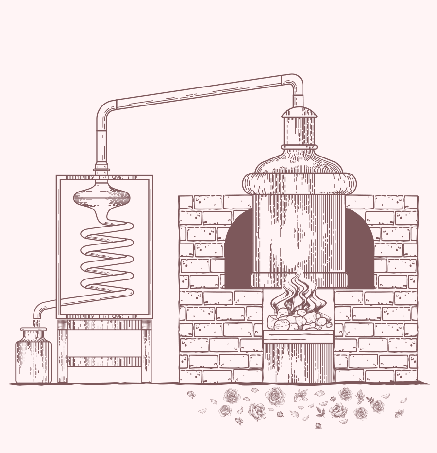 Rosense rose water is produced by using a distillation technique from the damascena rose petals. There are no chemical preservatives added during distillation and the product is completely free from any petrochemical derivatives and chemicals. In the process of distillation, large stills, traditionally of copper, with 3 tons capacity, are filled with 500kg of fresh blossoms and 1.5 tons of water. The still is fired for 90 minutes. The vaporized water and rose oil exit the still and enter a condensing apparatus and are then collected in a flask. This distillation yields a very concentrated oil (direct oil), which makes up about 20% of the final product. The water which condenses along with the oil is drained off and redistilled (cohobation), in order to obtain the water-soluble fractions of the rose oil such as phenethyl alcohol which are a vital component of the aroma and which makes up the large bulk, 80%, of the oil. The two oils are combined and make the final rose otto. The hydrosol (Herbal distillate) portion of the distillate is known as rosewater. Rosewater is the natural water that is obtained through the mixture of the oily water (ferment) with rose scent, which is an outcome of the production of rose oil with pure, clean hot water, distilled in the proportion of 1 /1. Rose water, which is produced using natural methods, is filtered several times.